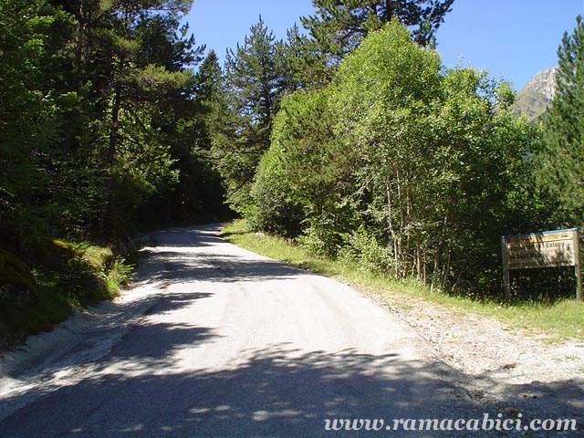 Poco antes de llegar al segundo parking ( Km. 11) encontramos de nuevo un rampón al 18%..... mientras un cartel nos da la "bienvenida" al Parque Nacional de Aigüestortes i Estany de Sant Maurici....
