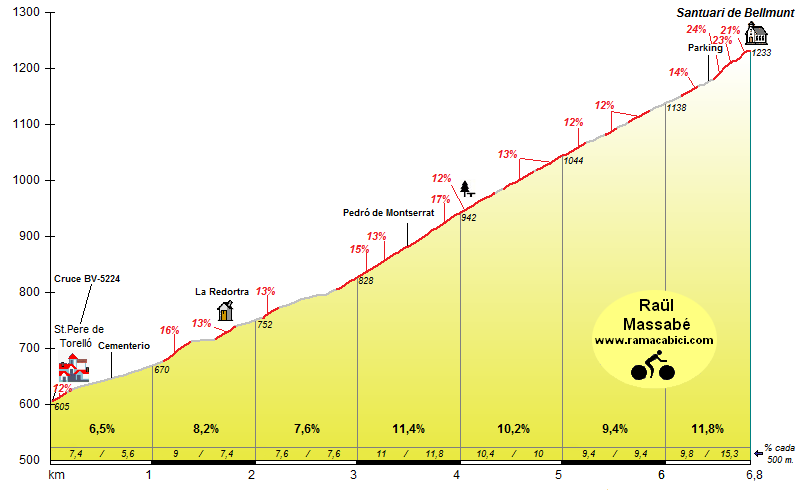 Los primeros metros de ascensión los haremos entre las casas de St. Pere de Torelló. Pese a ser un recorrido urbano ya nos encontraremos unas primeras rampas de hasta el 11%. Iremos siguiendo los indicadores en dirección al Santuari de Bellmunt hasta que lleguemos al cementerio del pueblo (Km 0,6) donde un nuevo cartel (dirección al Santuari) nos indicará que debemos tomar un camino de tierra. Pese a que pueda parecer extraño tomaremos este camino de tierra (sólo serán unos 50 metros sin asfalto) y tras rodear el recinto del cementerio una carretera nos conducirá hasta la montaña. Pese a que no estemos subiendo "por la montaña" si que estaremos subiendo en metros e incluso encontraremos rampas duras (13%). Ya a partir del kilómetro 2 aproximadamente empezaremos a ascender por la ladera de la montaña con rampas muy exigentes que nos harán ganar altura rápidamente. Serán casi 5 Km de rampas durísimas que en ocasiones nos harán tener la sensación de estar "escalando" más que subiendo en bicicleta. No encontraremos ni un sólo descanso hasta llegar ,en kilómetro 6,5, al parking de coches donde la pequeña explanada nos puede servir para tomar aliento de cara a los últimos 400 metros infernales. Un tramo de cemento con una pendiente media del 14,2% y rampas de hasta el 23%.